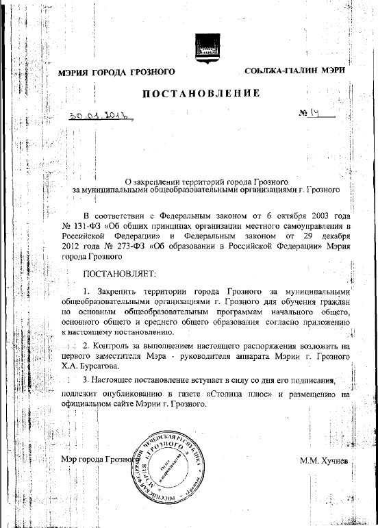 Постановление о закреплении территорий города Грозного за муниципальными общеобразовательными организациями г. Грозного